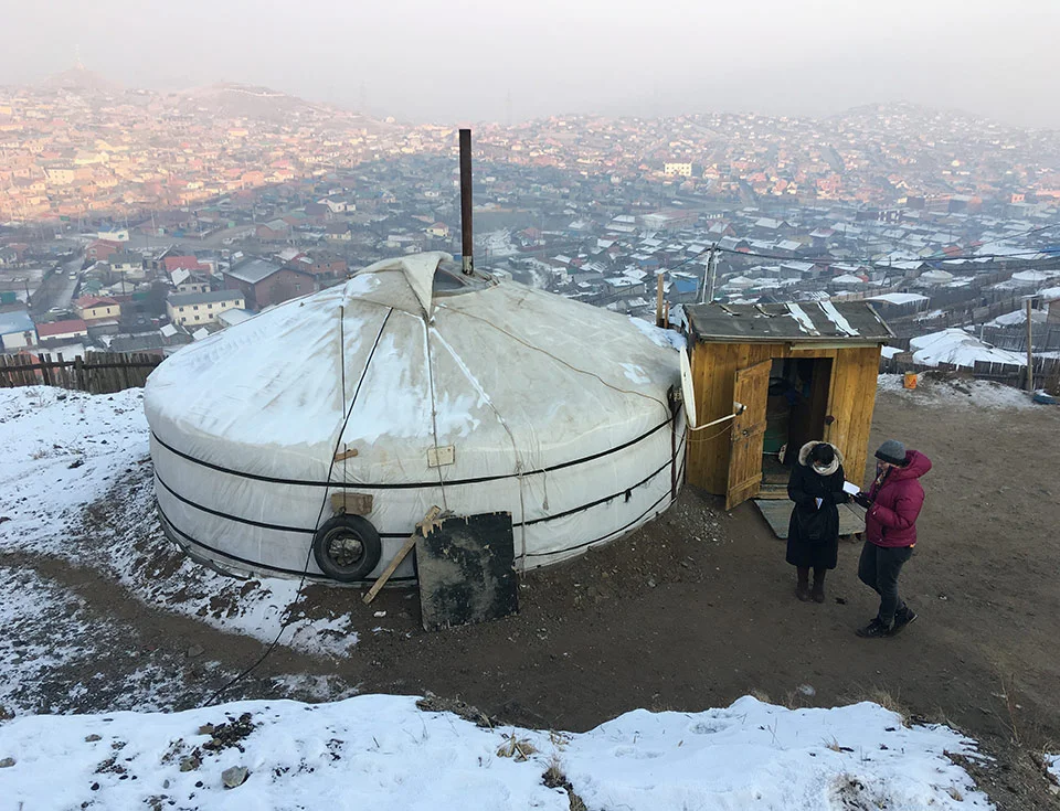 In the Mongolian capital of Ulaanbaatar, the cold climate and air pollution go hand in hand. The city is the coldest capital on earth, with wintertime temperatures dropping below -40 ºC. Its population relies largely on raw coal to survive the harsh winters, and as a result the daily air pollution levels are regularly 30 times higher than what is considered safe by the World Health Organization. Compounding the problem is the city's rapid growth—a shortage of long-term housing means that nearly 60% of the city's population live in traditional gers whose shape and structure can trap the toxins associated with pollution-related health effects.